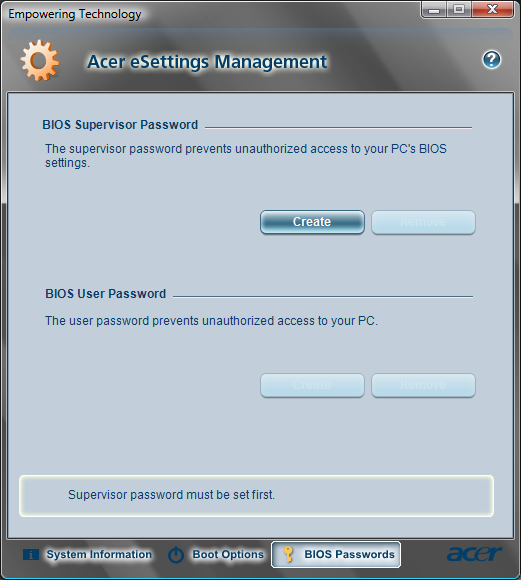 This method will work only if you can boot into your Acer computer. Once you boot in, you can use Acer eSettings Management to reset the BIOS password.