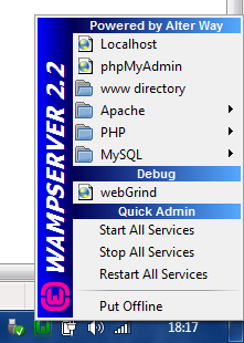 Single left-click on the WAMPServer icon shows a menu – localhost, phpMyAdmin, www directory, Apache, PHP, MySQL, webGrind, Start All Services, Stop All Services, Restart All Services, and Put Online/Offline.