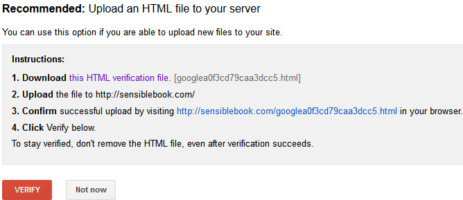 Step 5: Verify domain ownership is the very first step during configuration. The Upload an HTML file to your server method is used for domain verification. That is, download the specified HTML file and upload it to the base folder of your website. Click Verify.